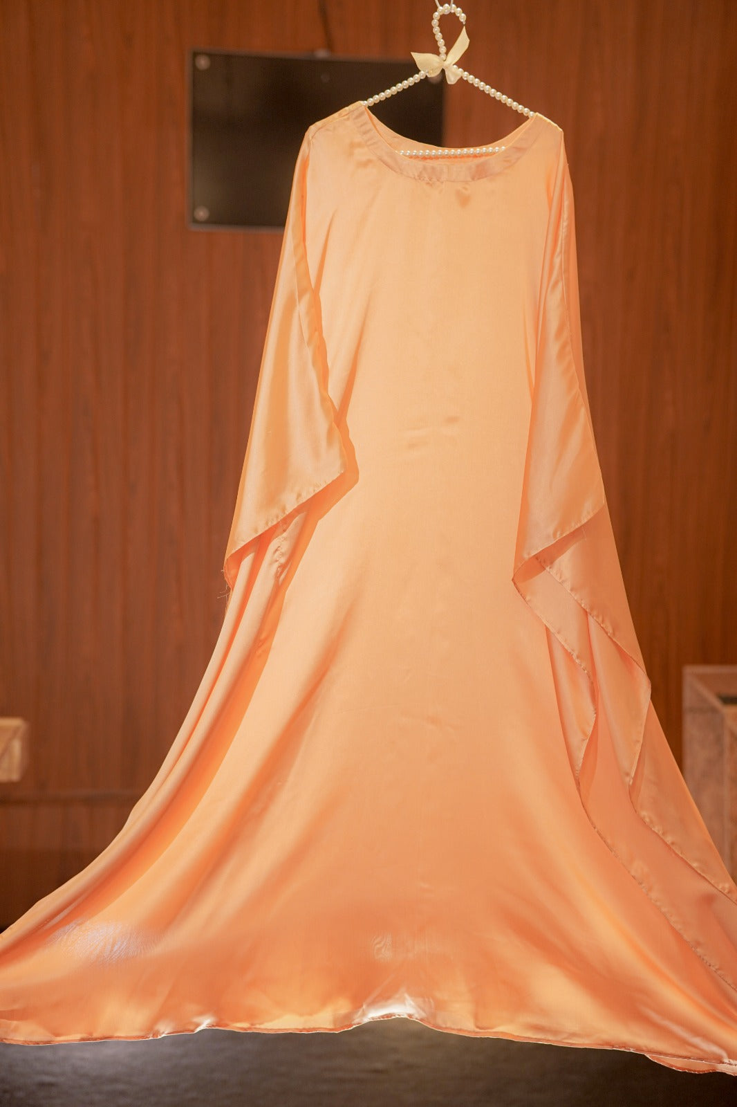 Product Detail: The Twistal Long Dress, designed with twist knot detailing on the bodice and flared sleeves for a unique and stylish look. Made from peachy chiffon with a stitched inner for a comfortable fit. Elevate your wardrobe with this must-have dress.